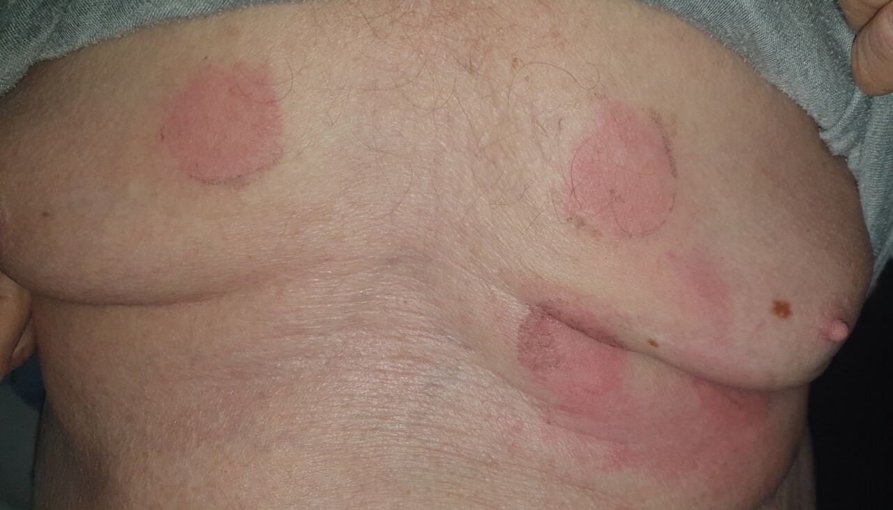 Jérôme, 65 ans, diabétique bien équilibré, consulte suite à l’apparition de lésions érythémateuses et prurigineuses au niveau du thorax (figure). L’interrogatoire révèle qu’il a bénéficié d’un électrocardiogramme de dépistage la veille pour son suivi cardiovasculaire.