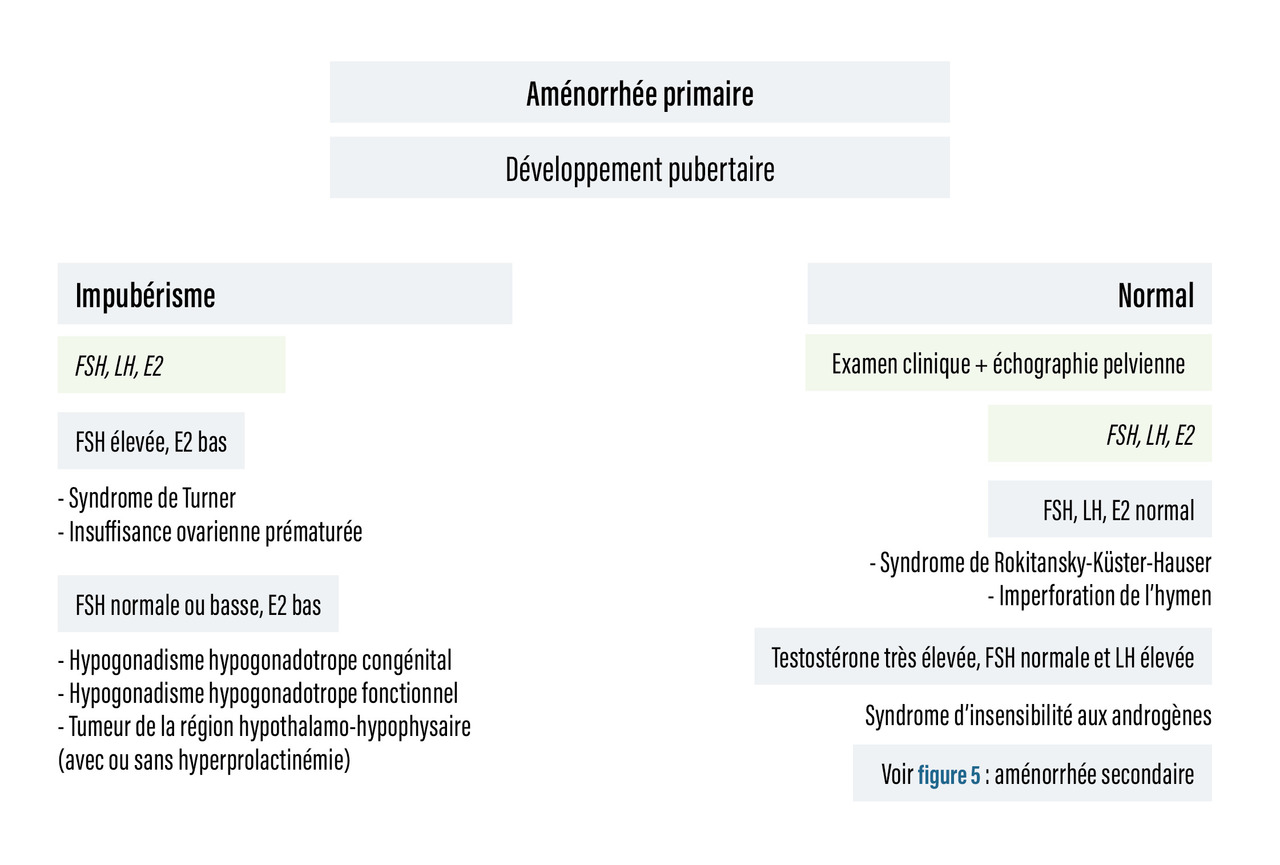 Les arbres diagnostiques devant une aménorrhée primaire et secondaire, synthétisant ces éléments, sont représentés respectivement dans les figures 4 et 5.