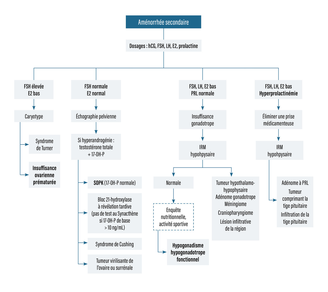 Une enquête étiologique est nécessaire après avoir caractérisé le type d’aménorrhée (primaire ou secondaire).