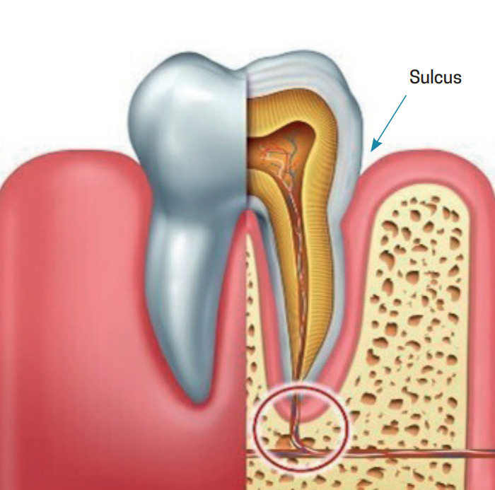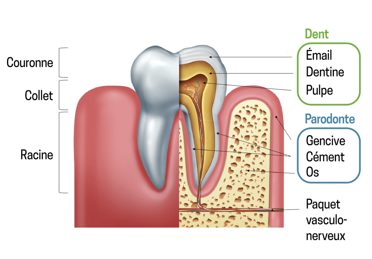 - la dent est composée de la couronne (visible), du collet (jonction couronne-racine) et de la racine (ancrée dans l’os alvéolaire) ;
