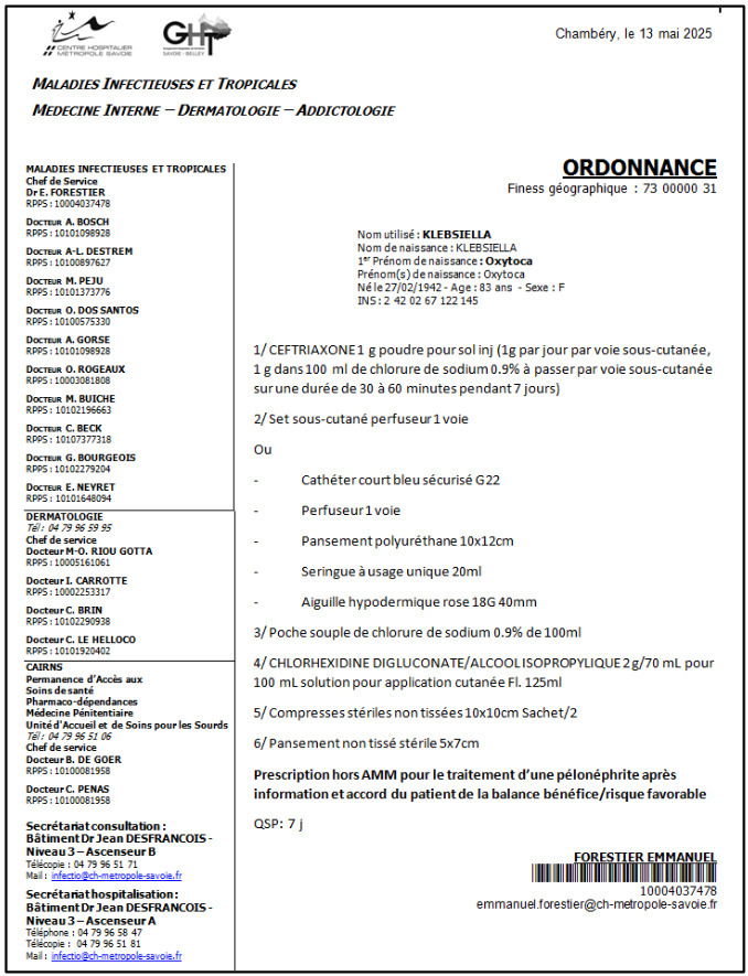 Forestier E, Gavazzi G, Diamantis S, et al. Antibiothérapie sous-cutanée : recommandations de bonne pratique clinique SPILF/SFGG 2025. Journées nationales d’infectiologie 12 juin 2025.