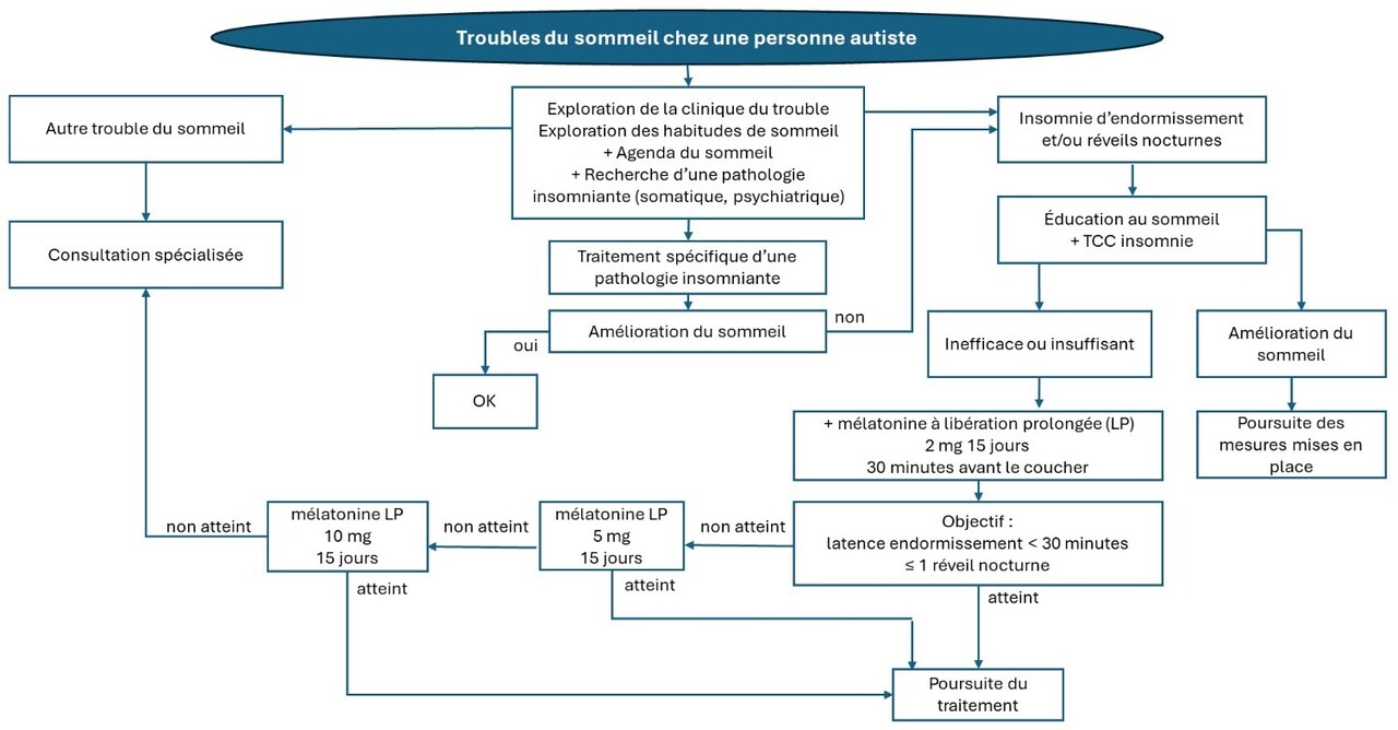 - en cas de troubles significatifs et chroniques du sommeil, en complément de mesures éducatives, comportementales et hygiénodiététiques (cf. figure) ;