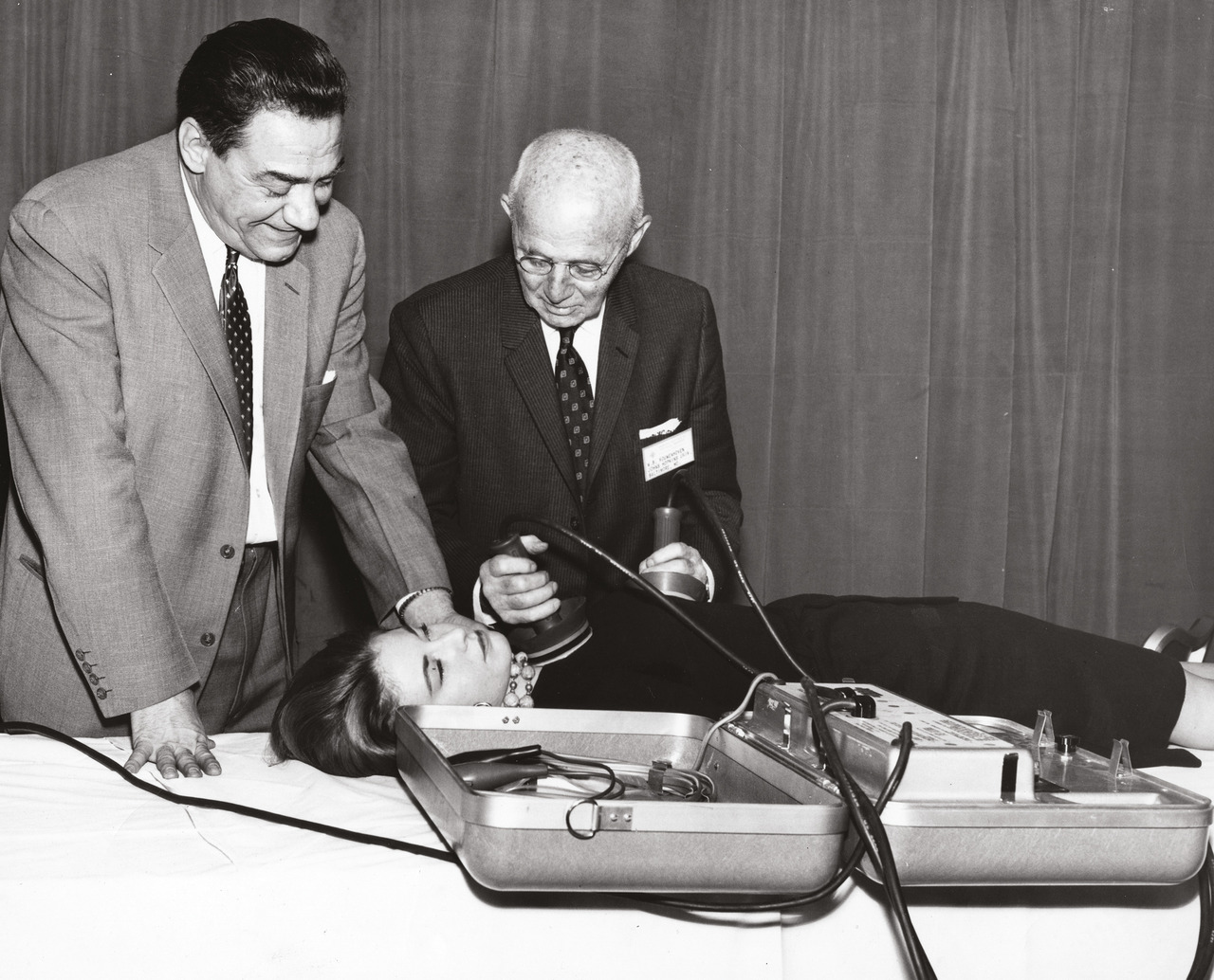 Mais, en France, s’il reconnaît l’efficacité de la méthode, Antoine Portal ne la recommande pas à cause de son caractère « répugnant et vulgaire » prouvant ainsi que la pudibonderie du XIXe siècle commence à s’installer en médecine. Quant au massage cardiaque, il ne le considère pas comme très efficace ( !) Si bien qu’il faudra attendre 1960 pour que William Kouwenhoven et Peter Safar décrivent correctement la technique. On sait maintenant que ce massage assure aussi une ventilation minimale. D’ailleurs, le même Kouwenhoven avait proposé en 1957 un instrument fondamental de la réanimation cardiaque : le défibrillateur électrique externe (fig. 2).