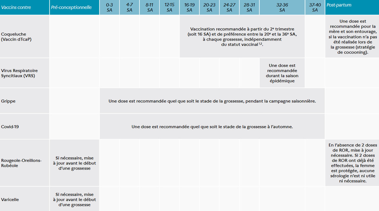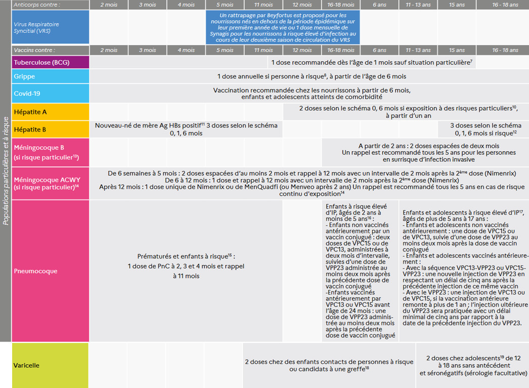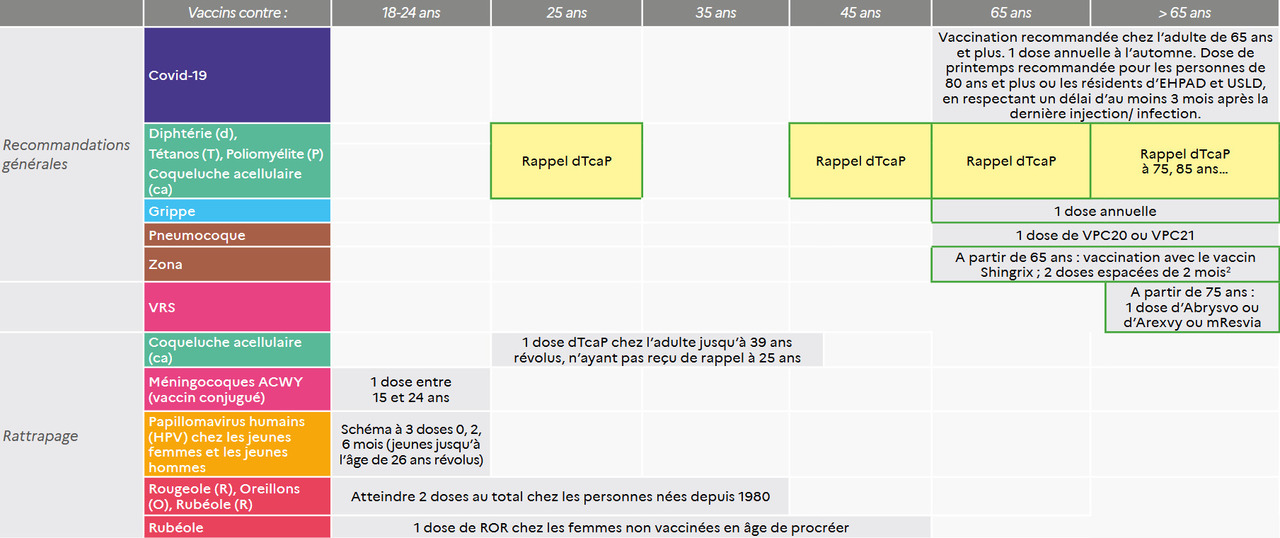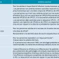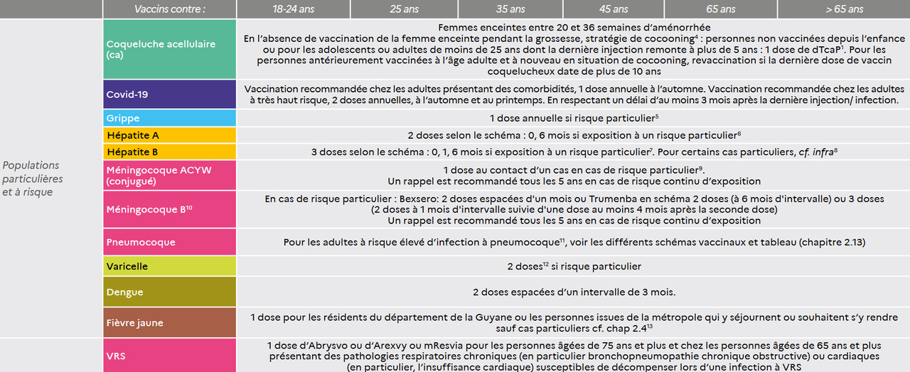 Les récapitulatifs des nouvelles recommandations sont indiqués pour les enfants et adolescents dans les tableaux 1, 2, et 3 (enfants dans les DROM), et pour les adultes en population générale dans les tableaux 4 et 5. Le tableau 6 récapitule les recos pour la femme enceinte, et les tableaux 7 et 8 concernent les 65 ans et plus (respectivement, en population générale et en situation à risque).