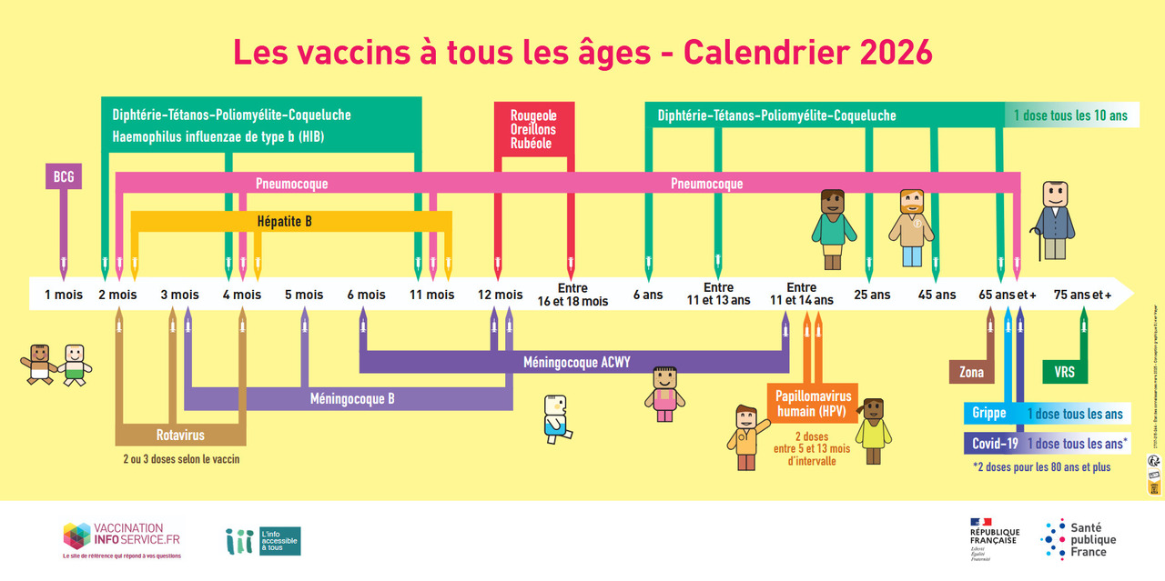 En outre, Santé publique France a partagé différents outils à mettre à disposition du grand public (enfants, adolescents, seniors, migrants, etc.), comme par exemple l’affiche « Les vaccins à tous les âges – calendrier 2026 » (figure). Parmi ces outils, on retrouve la nouvelle brochure pédagogique « Comprendre la vaccination », ainsi que la carte postale 2026 , qui présente le calendrier simplifié des vaccins recommandés tout au long de la vie. Elle est traduite en 5 langues (arabe, anglais, mandarin, turc et espagnol) ; toutes les versions sont disponibles sur le site de Santé publique France. Elle existe aussi en version DROM , prenant en compte les vaccinations supplémentaires préconisées chez les enfants vivant dans ces territoires.