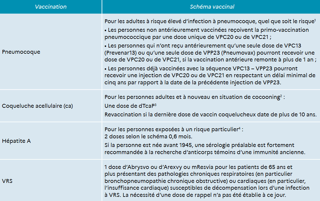 La vaccination contre les infections à pneumocoques est élargie à l’ensemble des 65 ans et plus selon un schéma à dose unique de Prevenar 20 ou de Capvaxive. Pour les adultes à risque âgés de 18 ans et plus, elle est également effectuée avec le Prevenar 20 ou le Capvaxive.