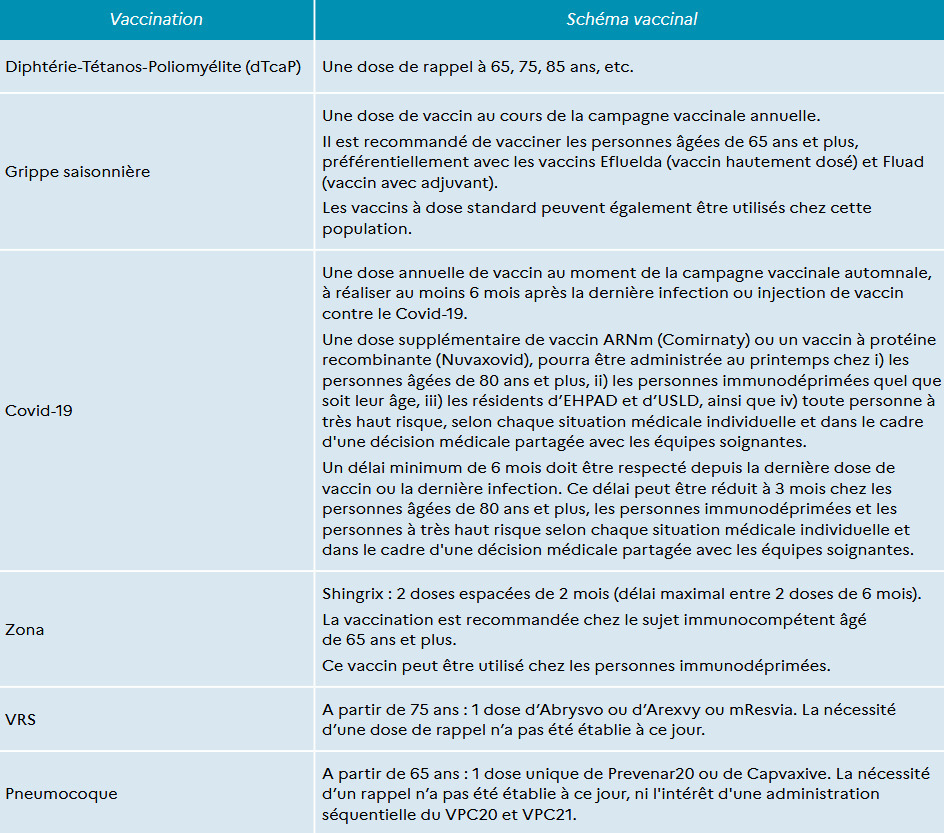 Il est recommandé de vacciner les 65 ans et plus, préférentiellement avec les vaccins Efluelda (vaccin hautement dosé) et Fluad (vaccin avec adjuvant). Les vaccins à dose standard peuvent également être utilisés dans cette population.