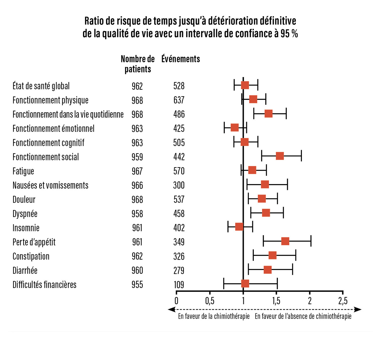 Inversement, et comme on pouvait s’y attendre, il existait davantage d’événements indésirables (graves, de grade ≥ 3 ou tous confondus) et une qualité de vie altérée dans tous les domaines dans le groupe de patientes randomisées pour la chimiothérapie (fig. 4). En revanche, lorsqu’elle était réalisée, la chimiothérapie était rarement interrompue avant la fin des quatre cycles prévus, montrant le respect d’une bonne dose-intensité relative qu’explique certainement le schéma court employé, adapté à l’âge.