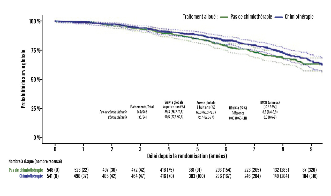 - recherche d’un bénéfice apporté par la chimiothérapie sur la survie globale, critère de jugement principal robuste, reproductible et centré sur le patient, et qui soit cliniquement significatif (hazard ratio de 0,61, correspondant à un bénéfice absolu de 7,5 % à quatre ans) pour compenser et justifier les effets indésirables attendus de la chimiothérapie ;