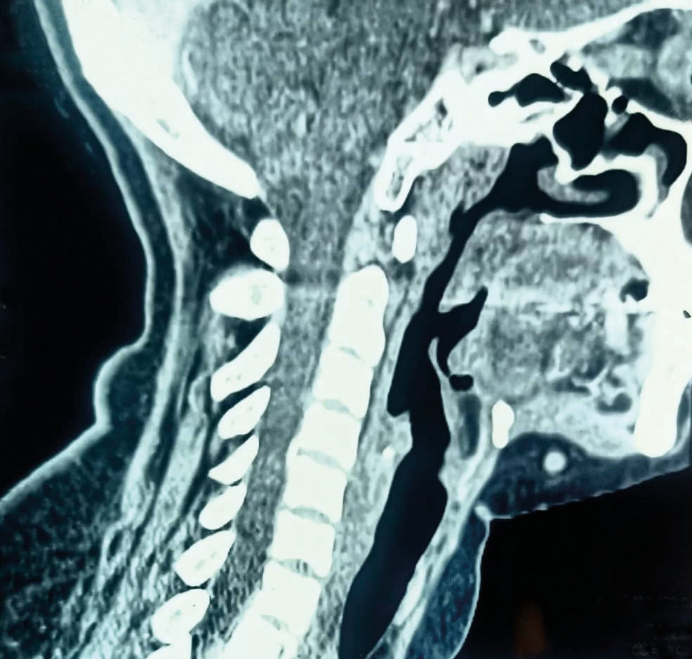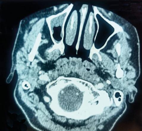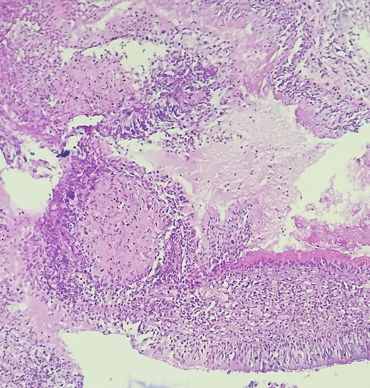 Une patiente âgée de 40 ans est admise à l’hôpital pour exploration d’adénopathies cervicales. L’interrogatoire révèle une obstruction nasale chronique accompagnée d’une rhinorrhée. L’endoscopie met en évidence une rhinite croûteuse avec un bombement du cavum (fig. 1). La tomodensitométrie montre un cavum pseudotumoral (fig. 2, 3 et 4). L’histologie objective un processus granulomateux tuberculoïde (fig. 5). Le GeneXpert sur fragment de biopsie, l’intradermoréaction à la tuberculine et la recherche de bacille de Koch dans les crachats sont négatifs.