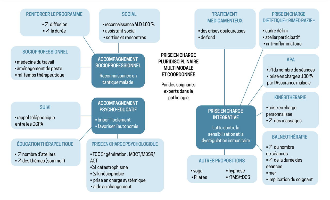 Concrètement, les traitements médicamenteux regroupent antalgiques (paliers 1 et 2), AINS (oraux ou topiques), corticoïdes oraux, antidépresseurs tricycliques et médicaments indiqués pour le traitement des arthrites inflammatoires. Les traitements non médicamenteux regroupent la kinésithérapie, la balnéothérapie, l’activité physique adaptée, l’accompagnement diététique et psychologique, et la participation à des groupes/ateliers thérapeutiques. Les propositions thérapeutiques sont individualisées et adaptées à chaque patient. Une étude qualitative phénoménologique et interprétative a été réalisée auprès de 11 patients ayant participé au programme Chik-Tambouyé 51. Les données ont été recueillies par des entretiens semi-dirigés, enregistrés et retranscrits intégralement.