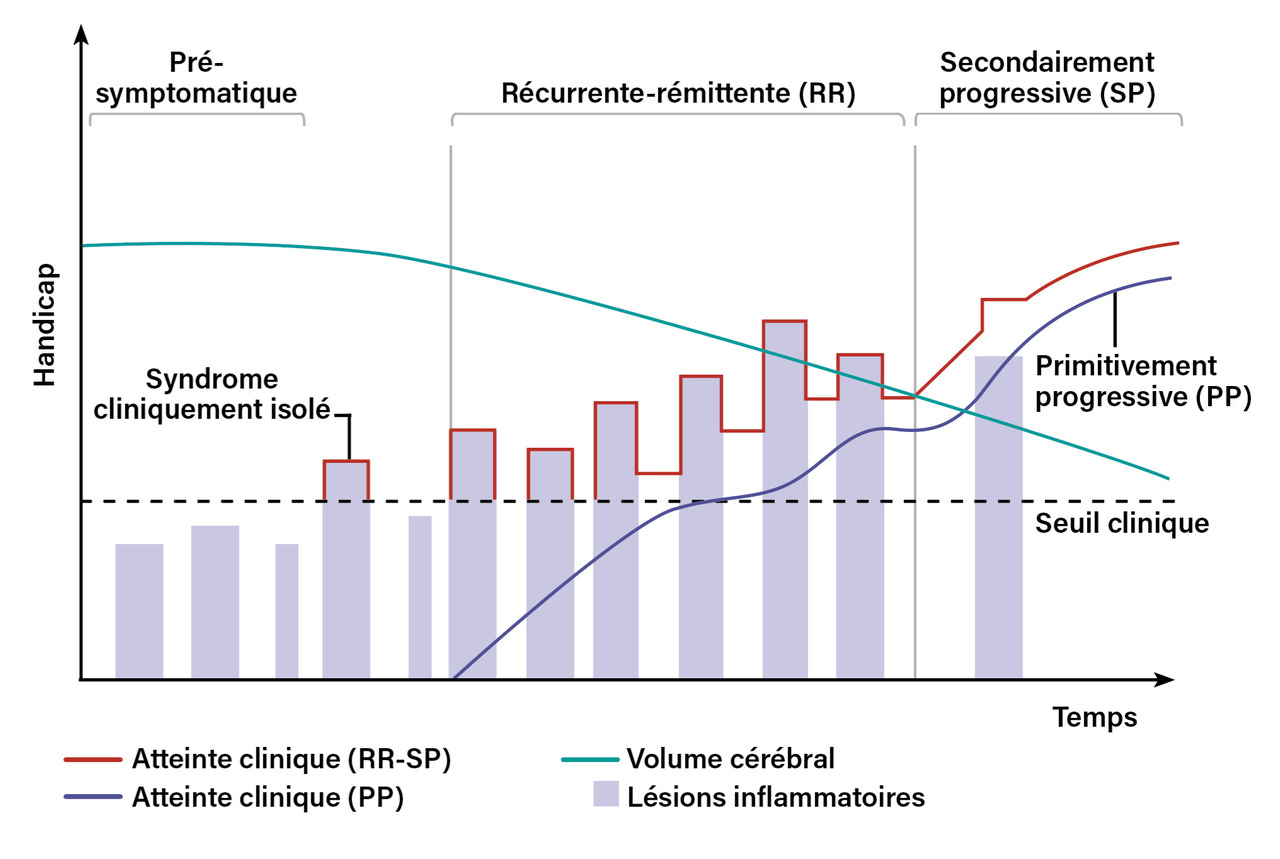 Après quinze à vingt ans de maladie en moyenne, en l’absence de traitement, la plupart des patients basculent vers une forme de progression lente sans rémission, dite « secondairement progressive » (SP).