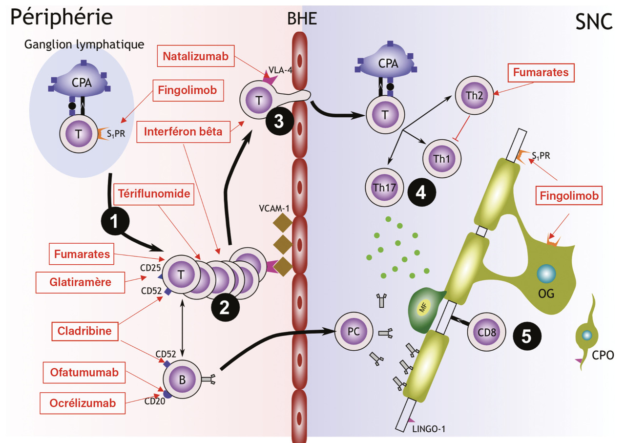 Ces deux traitements se distinguent toutefois par leur mode d’action spécifique. L’interféron bêta, à l’image de la protéine naturellement produite par l’organisme en réponse à une agression, se lie à des récepteurs exprimés à la surface des lymphocytes et des macrophages. L’acétate de glatiramère, copolymère de structure proche de celle de la protéine basique de la myéline (PBM), induirait quant à lui une tolérance immunitaire.