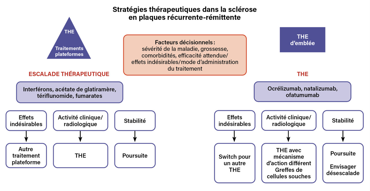 Le choix des traitements des formes récurrentes-rémittentes et des formes progressives repose sur une évaluation individualisée. Quel qu’il soit, le traitement doit être instauré le plus précocement possible afin de limiter l’accumulation de handicaps. La prévention de l’évolution et des comorbidités est également essentielle.