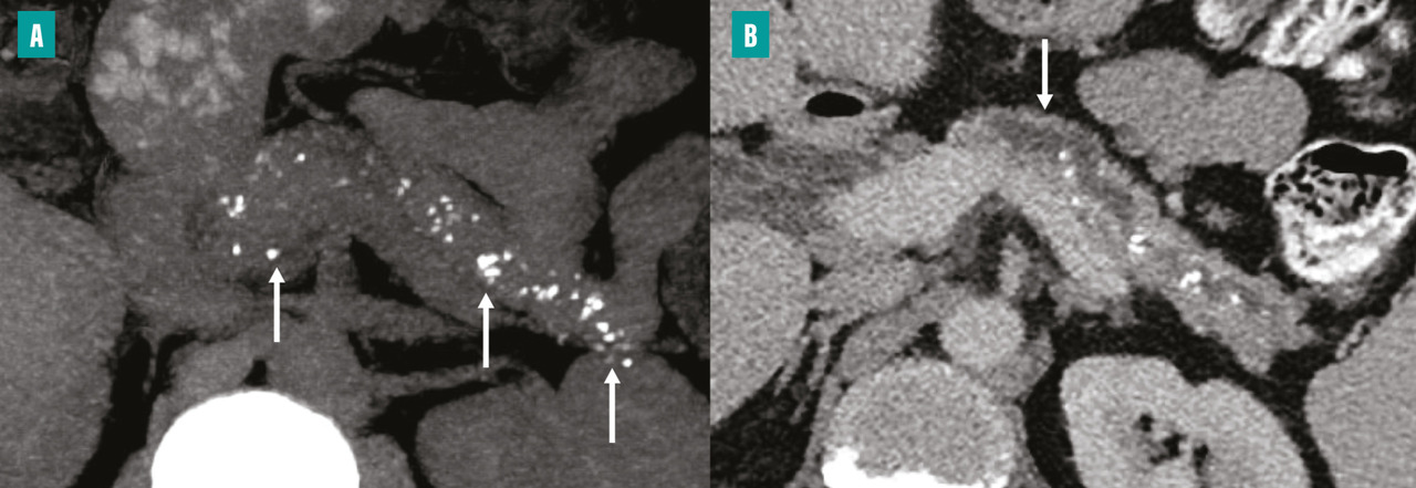 La tomodensitométrie (TDM) est l’examen initial le plus approprié en cas de suspicion de pancréatite chronique, car elle permet d’identifier des lésions caractéristiques telles que les calcifications parenchymateuses ou des conduits pancréatiques, ainsi que l’atrophie du parenchyme pancréatique. Un protocole TDM optimal comprend des acquisitions sans injection de produit de contraste, une phase artérielle pancréatique (environ 35 à 40 secondes après l’injection) et une phase veineuse (70 à 80 secondes après l’injection). Les calcifications sont facilement détectées sous forme d’hyperdensités spontanées sur les acquisitions sans injection. Elles peuvent être de taille variable. Dans les formes avancées de pancréatite chronique, la TDM peut montrer une dilatation irrégulière du conduit pancréatique principal (fig. 2) et d’éventuelles complications, notamment les pseudokystes et les atteintes vasculaires. La TDM est en revanche moins performante dans les formes précoces de pancréatite chronique, en particulier en l’absence de calcifications. La taille et le nombre des calcifications pancréatiques doivent être évalués, car le degré de calcification dans la pancréatite chronique peut refléter l’évolution et la gravité la maladie.5 La présence de grosses calcifications constitue un signe très évocateur de pancréatite chronique. Cependant, certaines calcifications parenchymateuses pancréatiques liées au vieillissement, généralement ponctiformes (de 1 à 3 mm), ne traduisent pas nécessairement une pancréatite chronique.6