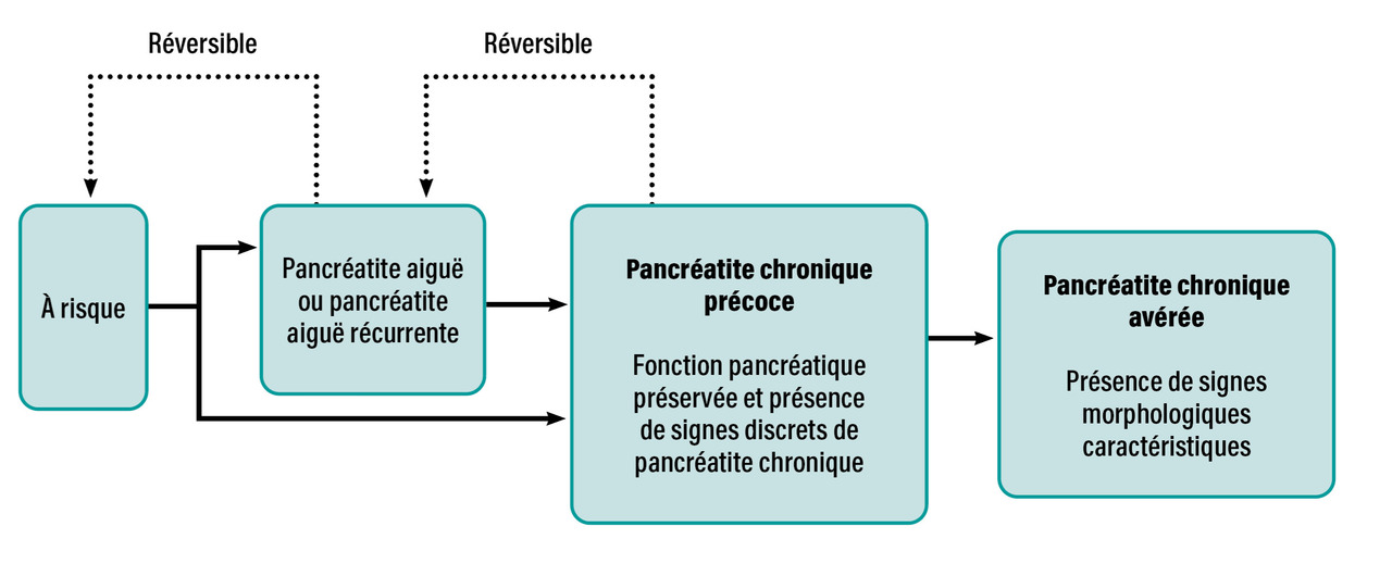 La pancréatite chronique se caractérise par des altérations morphologiques irréversibles du tissu exocrine et endocrine, associant inflammation et fibrose.1 Mais cette définition se heurte à l’absence habituelle de preuve histologique. Les sociétés savantes (International Association of Pancreatology, American Pancreatic Association, Japan Pancreas Society et European Pancreatic Club) intègrent maintenant le continuum pancréatite aiguë, pancréatites aiguës récidivantes, pancréatite chronique débutante et pancréatite chronique avérée, sur la base de critères cliniques et morphologiques (fig. 1).2,3