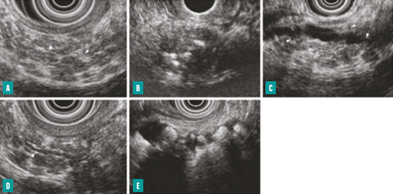 L’écho-endoscopie, apparue dans les années 1990, s’est positionnée comme l’examen de choix pour le diagnostic des pancréatites chroniques débutantes pour lesquelles la TDM et l’IRM manquent de sensibilité. La classification de Rosemont a défini des critères majeurs et mineurs concernant le parenchyme pancréatique et les canaux (fig. 4).8 Mais cet examen se heurte à deux limites : son manque de spécificité pour le diagnostic de pancréatite chronique et son caractère opérateur-dépendant.