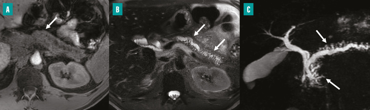 Dans les formes plus avancées, la CP-IRM met en évidence une atrophie plus marquée de la glande pancréatique, avec aspect en hyposignal T1, des dilatations irrégulières moniliformes du conduit pancréatique principal et des dilatations en « flammèches » des conduits secondaires (fig. 3).