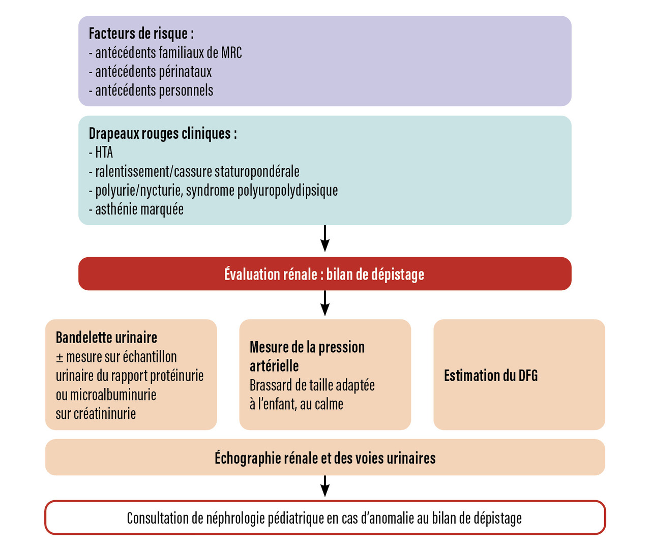 Le dépistage de la MRC est indiqué chez les enfants ayant un antécédent de néphrectomie, d’épisode d’insuffisance rénale aiguë, d’infections urinaires à répétition, de traitement prolongé par médicaments néphrotoxiques, de néoplasie, de cardiopathie congénitale, de maladie systémique ou d’obésité.