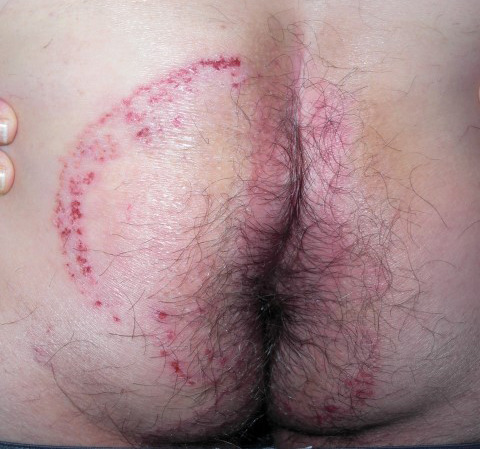 Après une incubation d’une durée variable – de quelques jours à deux mois –,2 des lésions souvent érythématosquameuses, circinées, avec une bordure active apparaissent. Elles siègent préférentiellement au niveau des zones de contact sexuel, comme le siège (fig. 1), le pubis, le scrotum, la racine des cuisses (fig. 2), le visage (notamment la barbe), mais peuvent également concerner d’autres zones du corps, comme les cuisses, l’abdomen (fig. 3), voire le tronc.1 - 3,7