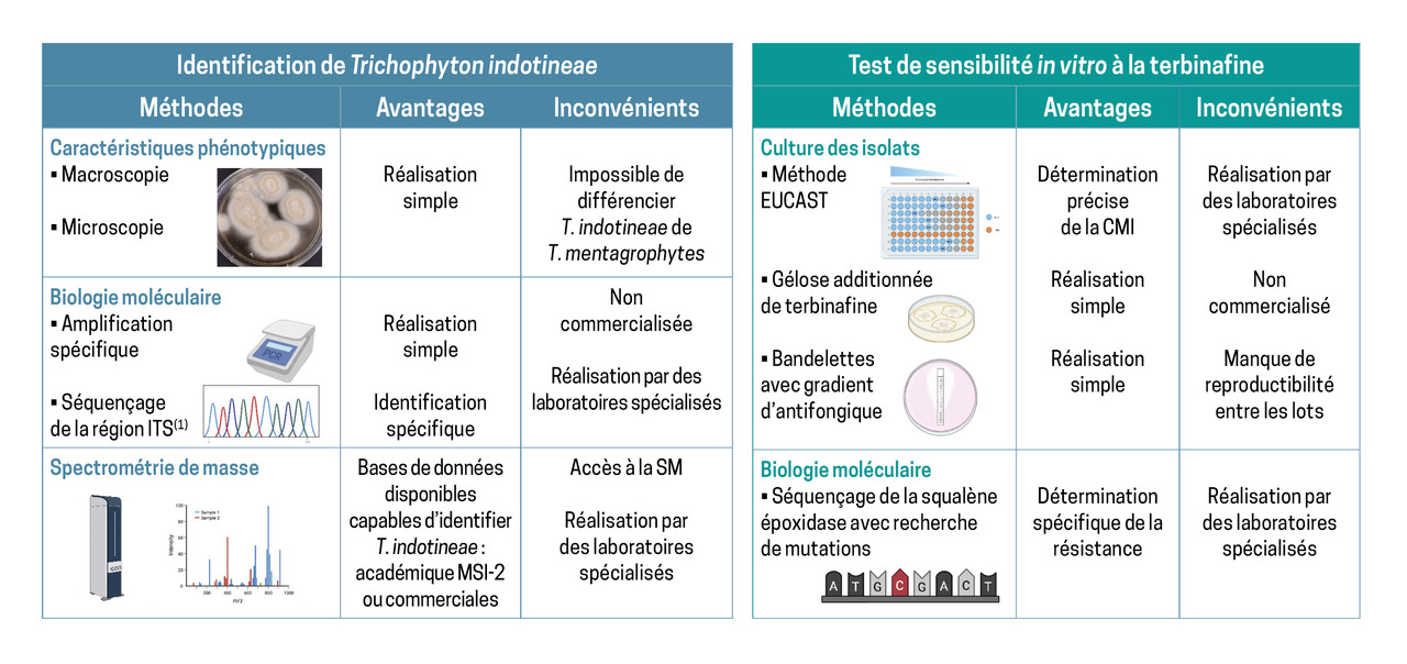 Dans le cas particulier de T. indotineae, le biologiste ou le mycologue se heurte fréquemment aux limites des techniques microscopiques classiquement utilisées en laboratoire de biologie médicale (fig. 4) : elles ne permettent pas de différencier T. indotineae des autres espèces du complexe T. mentagrophytes/interdigitale. De nouvelles technologies, telles que la spectrométrie de masse MALDI-TOF,9 le séquençage de l’ADN ou encore des PCR ciblées sur des prélèvements cutanés, ont donc été développées. Par ailleurs, des techniques pour évaluer la sensibilité aux antifongiques, combinées à la détection des mutations du gène codant pour la squalène époxidase (cible de la terbinafine), ont été mises au point pour dépister plus rapidement la résistance à la terbinafine.10