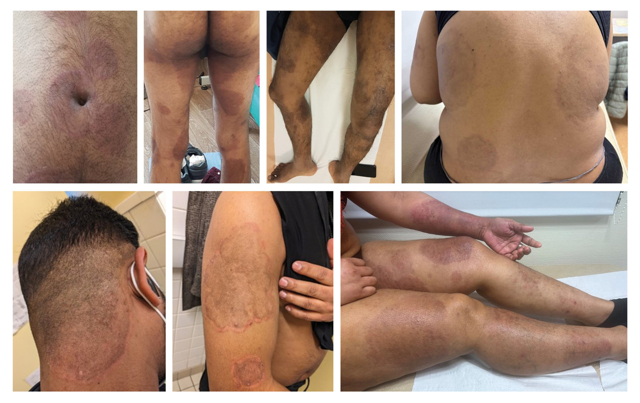 Auparavant rares, les DERT sont désormais plus fréquentes, notamment chez les patients rapportant un voyage récent en Inde, en Iran ou au Bangladesh (fig. 1). La forme clinique habituelle peut concerner l’ensemble du corps (Tinea corporis) ou l’aine (Tinea cruris) et se caractérise par l’absence de clairance centrale, l’apparition de plaques parfois étendues à l’aspect eczémateux plus ou moins inflammatoires.2 Une atteinte du visage est parfois observée, avec des formes atypiques se manifestant par une desquamation discrète, une bordure squameuse ou une extension vers l’oreille externe, la racine des cheveux, voire le cuir chevelu.2 Une pigmentation marquée est également possible, en particulier chez les patients à peau foncée (fig. 2). L’association à une atteinte palmaire et/ou plantaire (Tinea manuum/pedis), voire à une onychomycose, a aussi été rapportée.2 Enfin, un prurit persistant peut subsister, même après guérison clinique et mycologique.