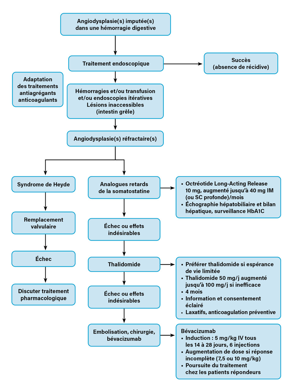 L’endoscopie constitue la pierre angulaire de la prise en charge diagnostique et thérapeutique des AGD. Cependant, le remplacement valvulaire (radiologique ou chirurgical) se discute rapidement dans le syndrome de Heyde, et des traitements pharmacologiques (AS et thalidomide principalement) s’envisagent lorsque les besoins transfusionnels sont trop élevés ou que les épisodes hémorragiques et les recours à l’endoscopie sont trop fréquents. Le bévacizumab, l’embolisation et la chirurgie se discutent dans les situations les plus réfractaires ou de sauvetage.