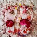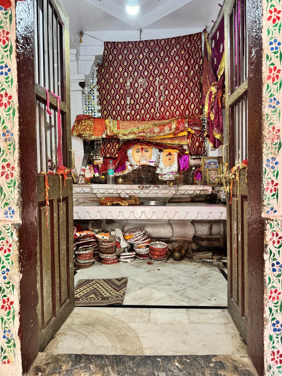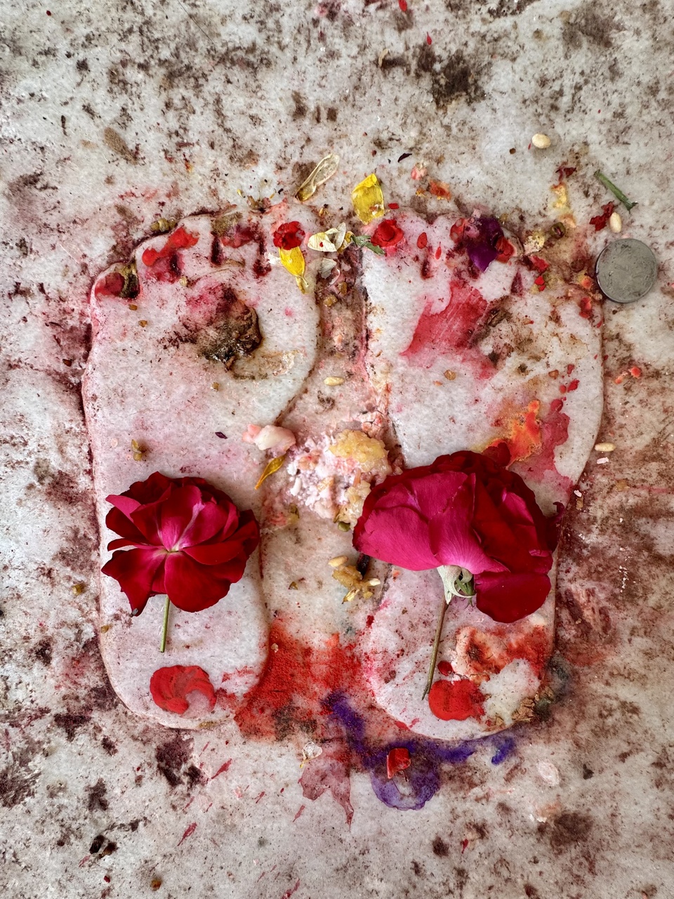Dans le sanctuaire, on ne retrouve aucune représentation de la maladie, mais les vêtements de la déesse sont couverts de points qui évoquent l’éruption varicelleuse. D’autres points sont peints sur les murs, mais leur origine est différente : après avoir prié pour une famille, celui qui est venu appose une tache de pigment rouge sur la paroi par personne visée par la protection. Dans l’allée centrale qui mène au saint des saints, l’empreinte des pieds de Shitala, sculptée dans un bloc de marbre blanc, est couverte de pétales de rose (fig. 4). Au fond, en surplomb, dans une semi-obscurité, la statue de culte est couverte de matières sacrificielles, avec quelques bijoux de mariage déposés sur ses pieds, ses bras et le dessus de sa coiffure. À ses pieds, des sachets de sel sont empilés les uns sur les autres : le brahmane le distribue pour soigner les lésions dermatologiques (sa proximité avec la figuration de la divinité le chargeant d’une puissance magico-religieuse thérapeutique).