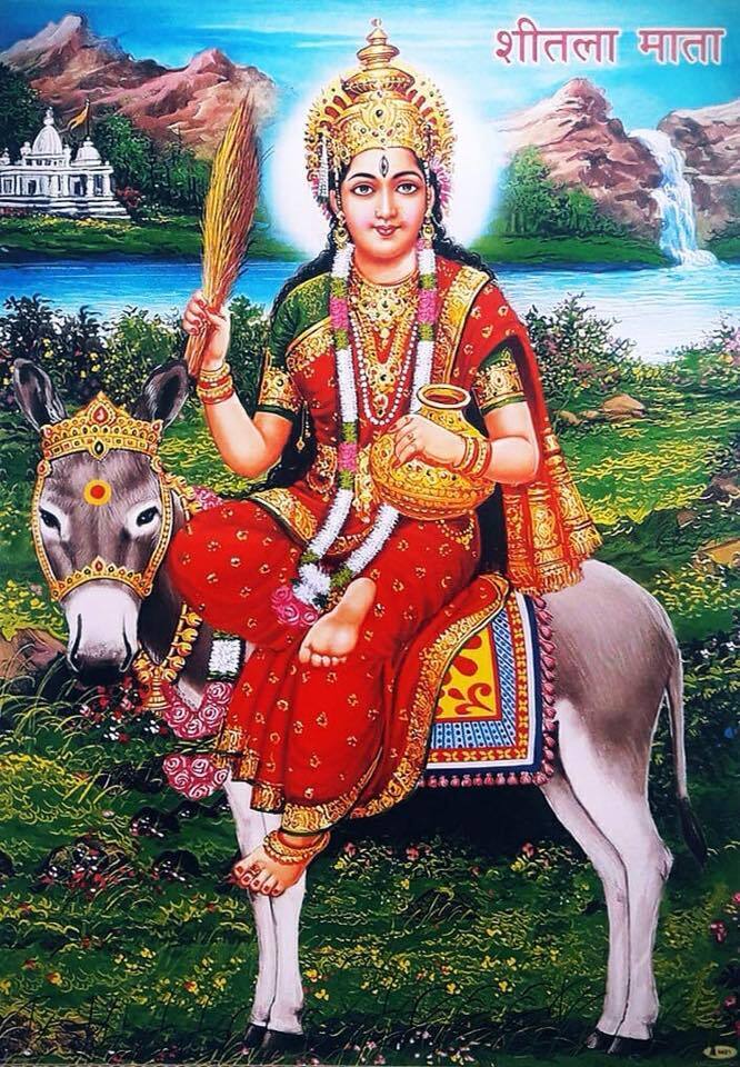 À la fin de l’hiver et au début du printemps survient, en Inde, un pic de fréquence de varicelle. C’est aussi le moment de la fête Holi. Sept jours après avoir joué avec les couleurs lors de cette fête célèbre dans le monde entier, les fidèles ont pour habitude d’aller prier Shitala pour demander une protection. À cette occasion, le brahmane peut leur offrir un tissu porté par la déesse : par transfert, il est destiné à agir de façon prophylactique pour celle ou celui qui, à son tour, le portera.