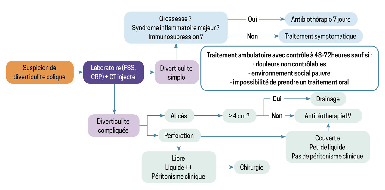Les diverticulites simples sont traitées en ambulatoire, avec ou sans antibiotiques, mais imposent un suivi rapproché au cabinet, l’évolution vers une diverticulite compliquée étant possible, même sous traitement.