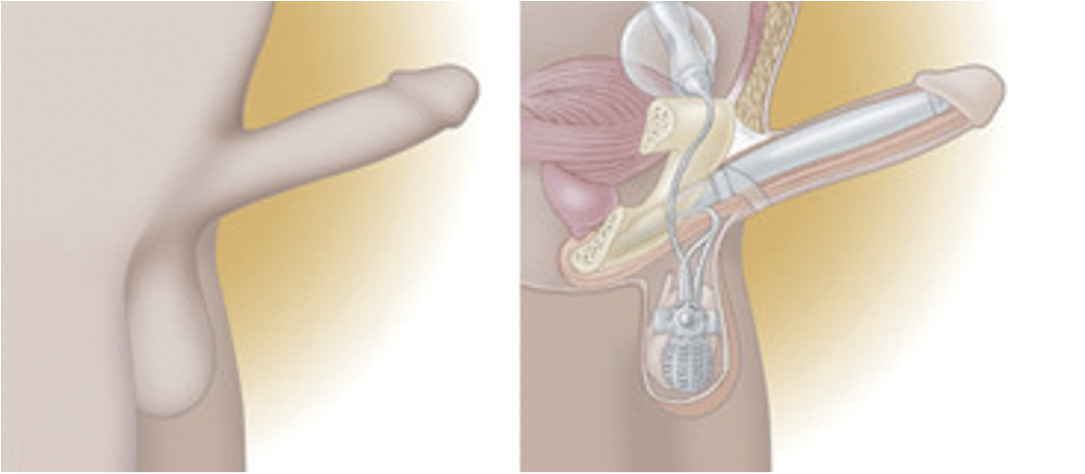 Plusieurs types d’abord existent mais aucun n’a fait preuve de sa supériorité. Le patient avec un facteur de comorbidité (diabète, tabac, obésité, blessé médullaire), et/ou en cas de fibrose des corps caverneux, doit être informé d’un risque majoré de complications. Les implants avec un « coating » antibiotique doivent être privilégiés (faible risque infectieux). Chez les patients sélectionnés et parfaitement informés, le taux de satisfaction est élevé, allant de 79 à 92 %. La durée de vie est élevée, avec un taux de dysfonctionnements de 10 % après 10 ans et 27 % après 15 ans, nécessitant une réintervention pour remplacement.