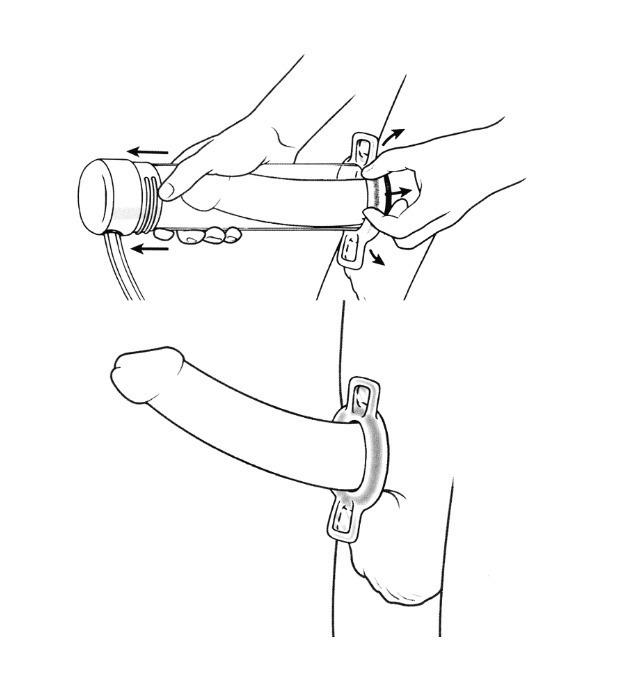 Les érecteurs à dépression négative (vacuums, fig. 4) sont des dispositifs mécaniques ou électriques permettant une érection passive du fait de la dépression induite par une pompe à vide reliée à un cylindre dans lequel est placée la verge. Le vacuum peut être proposé à tous les patients et d’autant plus à ceux qui sont intolérants ou non répondeurs ou ayant des CI aux traitements pharmacologiques. EI : sensation de froideur du pénis (partenaire), blocage de l’éjaculation, pétéchies et ecchymoses mineures.