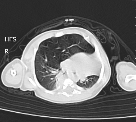 Un nouveau-né âgé de 1 mois est admis aux urgences pédiatriques pour prise en charge d’une détresse respiratoire. Le début de la symptomatologie remonte à la naissance, par l’installation d’une polypnée s’aggravant lors des cris et de l’alimentation, associée à des épisodes de toux sèche. L’examen clinique trouve un nouveau-né tachypnéique, cyanosé avec tirage intercostal et bombement de l’hémithorax droit associé à un wheezing auscultatoire et une SaO2 à 90 % à l’air ambiant. Le patient est mis sous oxygénothérapie et une radiographie thoracique est réalisée, objectivant une hyperaération de l’hémichamp pulmonaire droit refoulant le médiastin (fig. 1). Un scanner est effectué sans injection de produit de contraste et sans sédation, montrant une hyperclarté hypovasculaire avec une expansion du lobe supérieur gauche, refoulant le médiastin et la trachée à gauche, associée à une atélectasie du lobe inférieur droit et de l’hémichamp pulmonaire controlatéral (fig. 2). L’ensemble des éléments radio-cliniques plaident en faveur d’un emphysème lobaire géant compressif congénital (ELGC). Une lobectomie supérieure droite est réalisée, avec une bonne évolution clinique.