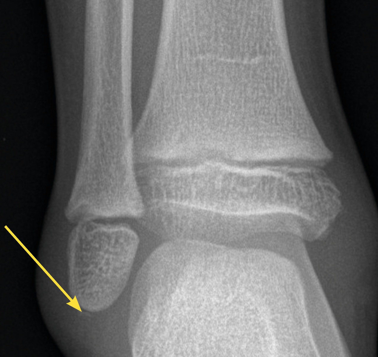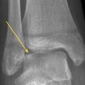 Le diagnostic différentiel est principalement constitué par les fractures. Celles-ci sont spécifiques du fait des particularités de l’os pédiatrique, et le tableau clinique n’est pas toujours aussi flagrant que chez l’adulte. Il n’est pas rare de voir des enfants conserver un appui partiel sur des chevilles fracturées. Dans environ 20 % des traumatismes en inversion, il existe une avulsion de la pointe de la fibula8 (fig. 2), qui doit être recherchée et traitée par une botte en résine durant un mois, quel que soit l’âge. Les décollements épiphysaires de la malléole externe sont beaucoup plus rares que ce qui a longtemps été cru6, et leur pronostic fonctionnel semble bon quel que soit le traitement.