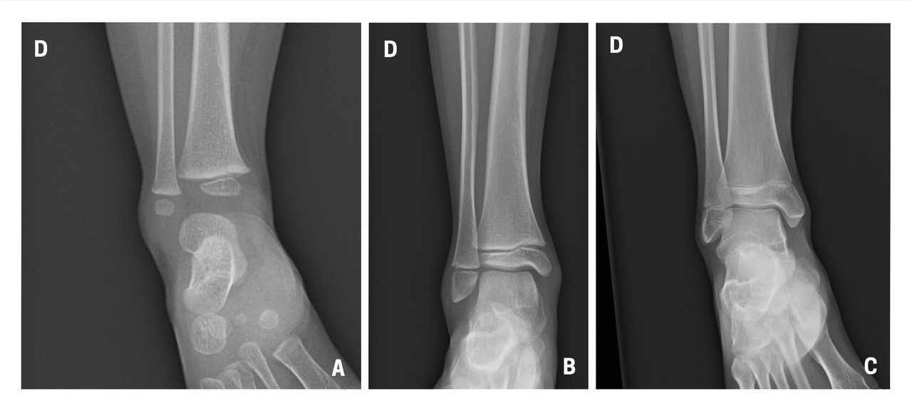 Il n’y a pas de consensus sur des tests cliniques (critères d’Ottawa…) car ils ont une faible sensibilité sur les fractures peu ou non déplacées.4 En cas de doute à l’examen clinique, il est donc nécessaire de demander au moins deux incidences : face et profil. Par ailleurs, la cheville étant initialement une matrice cartilagineuse qui va progressivement s’ossifier, la lecture des radiographies est parfois difficile chez l’enfant, dont les cartilages de croissance sont encore visibles (fig. 1). Dans environ 20 % des traumatismes, une fracture est retrouvée, notamment des avulsions de la pointe de la fibula, signe d’entorse grave, dont la prise en charge doit être rigoureuse pour éviter des instabilités chroniques.