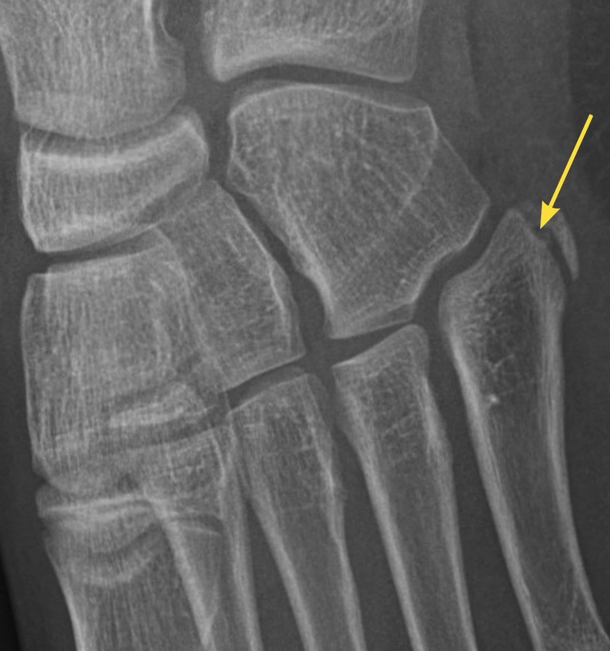 Certaines fractures non ou peu déplacées peuvent être de diagnostic difficile. La fracture de Tillaux touche préférentiellement les adolescentes en fin de croissance, avec une atteinte de l’extrémité distale et latérale de l’épiphyse tibiale. Le tableau clinique mime une entorse de cheville et le trait de fracture n’est pas toujours évident à la radiographie (fig. 3). La fracture étant articulaire, le scanner est souvent nécessaire pour décider d’une ostéosynthèse. Il faut également se méfier des fractures de la base du cinquième métatarsien, à ne pas confondre avec le noyau d’ossification secondaire. L’examen clinique permet donc d’orienter le diagnostic, car la radiographie peut être trompeuse (fig. 4).