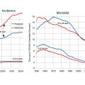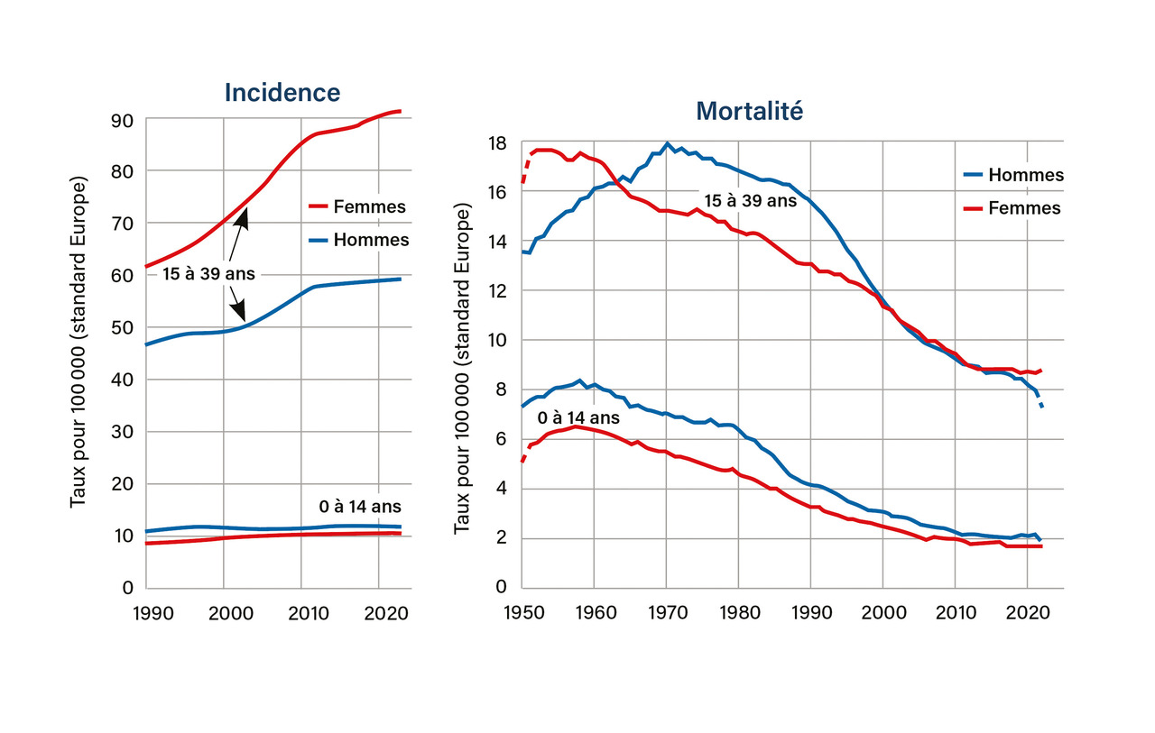 Entre 15 et 39 ans, l’incidence a augmenté fortement jusqu’en 2012 chez les hommes et chez les femmes, mais l’augmentation est moindre dans les années récentes ; la mortalité diminue chez les hommes depuis 1970 et chez les femmes depuis 1960. Entre 0 et 14 ans, l’incidence n’augmente pas chez les garçons et augmente très faiblement chez les filles, et la mortalité diminue depuis la fin des années 1950 (fig. 3B).
