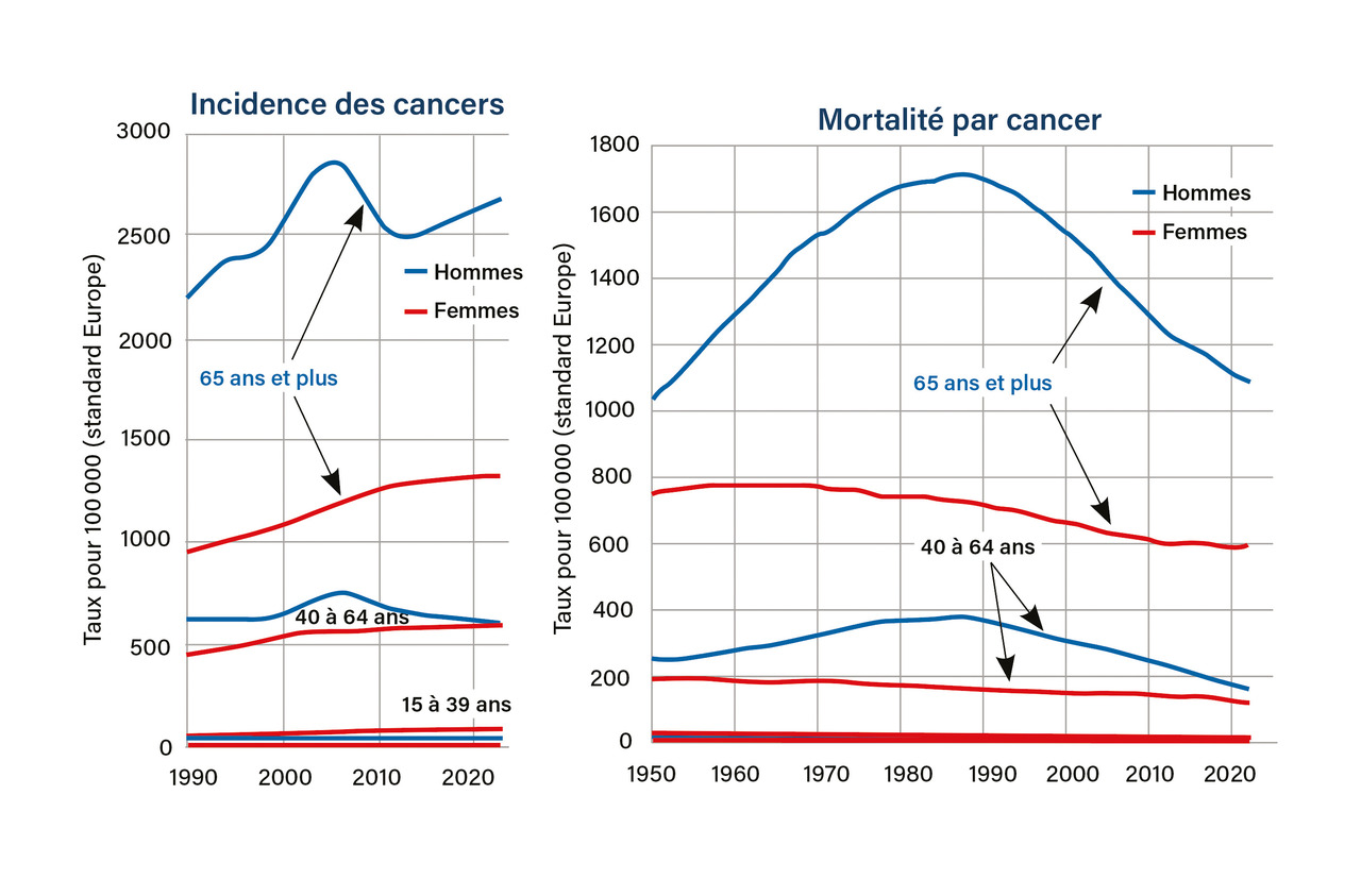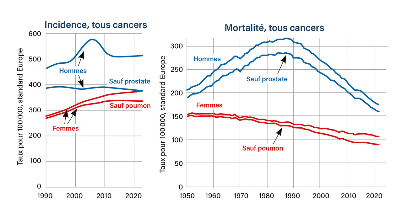 En dehors des conséquences de l’entrée des femmes dans le tabagisme à la fin des année 1960 et de l’augmentation du nombre de cancers du pancréas, l’incidence des cancers n’augmente pas ou très peu en France dans les années récentes, et la mortalité par cancer diminue nettement, et plus chez les hommes que chez les femmes. L’incidence n’augmente que dans certaines classes d’âge, et la mortalité n’augmente dans aucune classe d’âge.