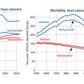 Ces deux corrections apportées, il n’y a pas d’augmentation importante du risque de cancer dans l’ensemble de la population. Chez les hommes, l’incidence des cancers augmente très peu depuis 2013 et l’essentiel des variations provient de l’évolution du cancer de la prostate ; la mortalité par cancer diminue depuis 1987 (fig. 2). Chez les femmes, l’incidence des cancers n’augmente dans les années récentes qu’à cause de la fréquence accrue des cancers du poumon, et la mortalité par cancer diminue depuis 1960.