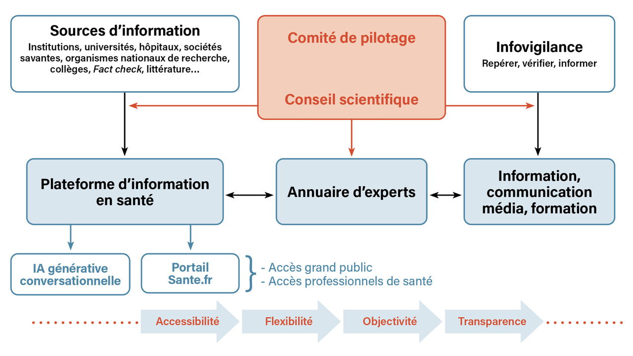 Une mesure centrale proposée dans notre rapport et adoptée par le gouvernement est la création d’un observatoire de l’information en santé (figure), qui coordonnerait l’ensemble du dispositif, avec un conseil scientifique indépendant et pluraliste. Un portail public modernisé hébergerait les informations de qualité existant en France. Ces actions seraient complétées par la mise à disposition de trois outils :