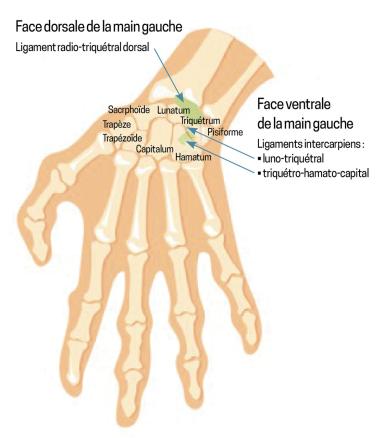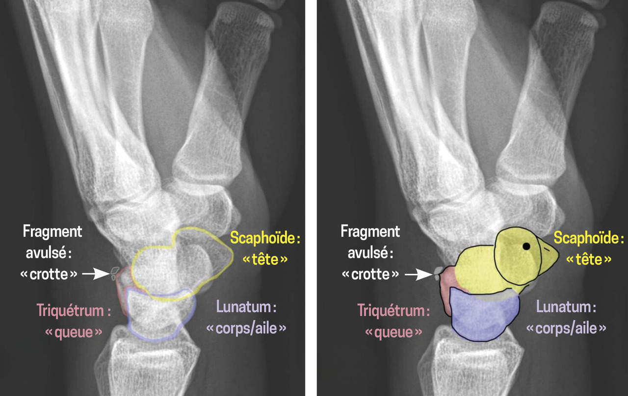 Un homme de 45 ans consulte après une chute accidentelle avec réception sur la main gauche en hyperextension. Il se plaint d’une douleur aiguë au niveau du poignet gauche ; un gonflement est apparu principalement sur le bord ulnaire. L’examen clinique révèle une douleur à la palpation du triquétrum, une limitation fonctionnelle du poignet mais l’absence de déformation visible. Les radiographies standard montrent une petite zone corticale osseuse avulsée sur la projection dorso-latérale du triquetrum.