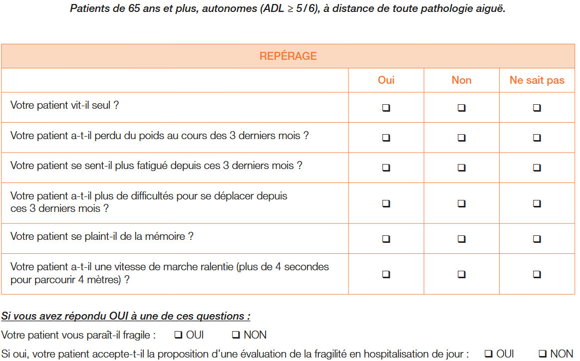 - le Vulnerable elders survey- 13 (VES- 13) [en 3 - 5 minutes], ici en version française (score ≥ 3 indicateur de fragilité) ;