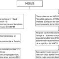 - MGUS à bas risque et assimilées (cf. figure) : abstention thérapeutique ; reporter la biopsie ostéomédullaire et l’imagerie, et après 6 mois réaliser les tests biologiques suivants : électrophorèse des protéines sériques, immunofixation, dosage sérique des chaînes légères libres kappa et lambda, hémogramme, calcémie, créatininémie. En cas de résultats stables, refaire ces tests tous les 2 - 3 ans ; s’ils ne sont pas stables, il faut les refaire plus souvent et éventuellement faire des examens complémentaires à la recherche d’une progression (notamment myélome multiple) ;