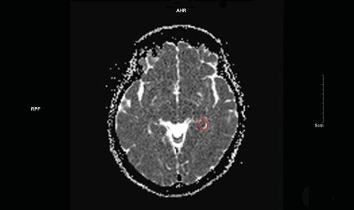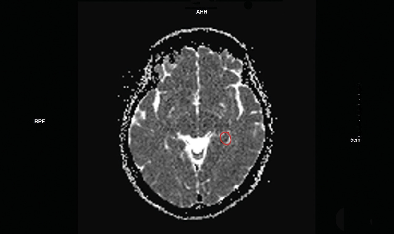 Une imagerie par résonance magnétique (IRM) cérébrale est réalisée quarante-huit heures après l’épisode, mettant en évidence un hypersignal punctiforme en séquence diffusion (fig. 1) et en hyposignal ADC (apparent coefficient diffusion) [fig. 2] localisé à la partie interne du lobe temporal gauche.