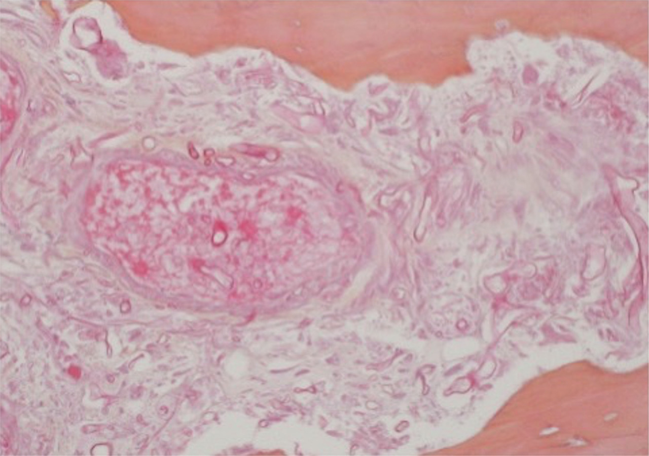 L’imagerie met en évidence une lyse osseuse ethmoïdale et du toit de l’orbite avec un envahissement des tissus de proximité. Le diagnostic repose sur les examens microbiologiques et sur l’analyse histologique des biopsies par endoscopie sinusienne, qui confirme l’envahissement muqueux et osseux par des champignons filamenteux, associé à un infiltrat inflammatoire chronique et une angio-invasion filamenteuse.
