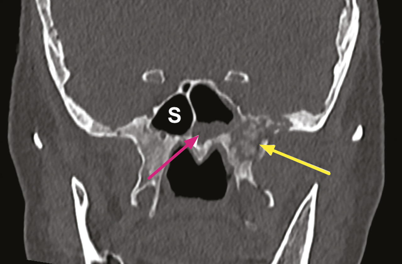 L’otite externe nécrosante (anciennement appelée otite externe maligne) est une infection grave survenant chez le patient immunodéprimé ou, plus souvent, diabétique.14 Elle débute au niveau de la peau du conduit auditif externe puis s’étend à l’os pétreux et à la base du crâne pour donner une ostéomyélite de la base du crâne. Ces otites sont majoritairement bactériennes, causées par Pseudomonas aeruginosa, mais dans environ 10 % des cas elles sont d’origine fongique, le plus souvent dues à Aspergillus flavus.14,15