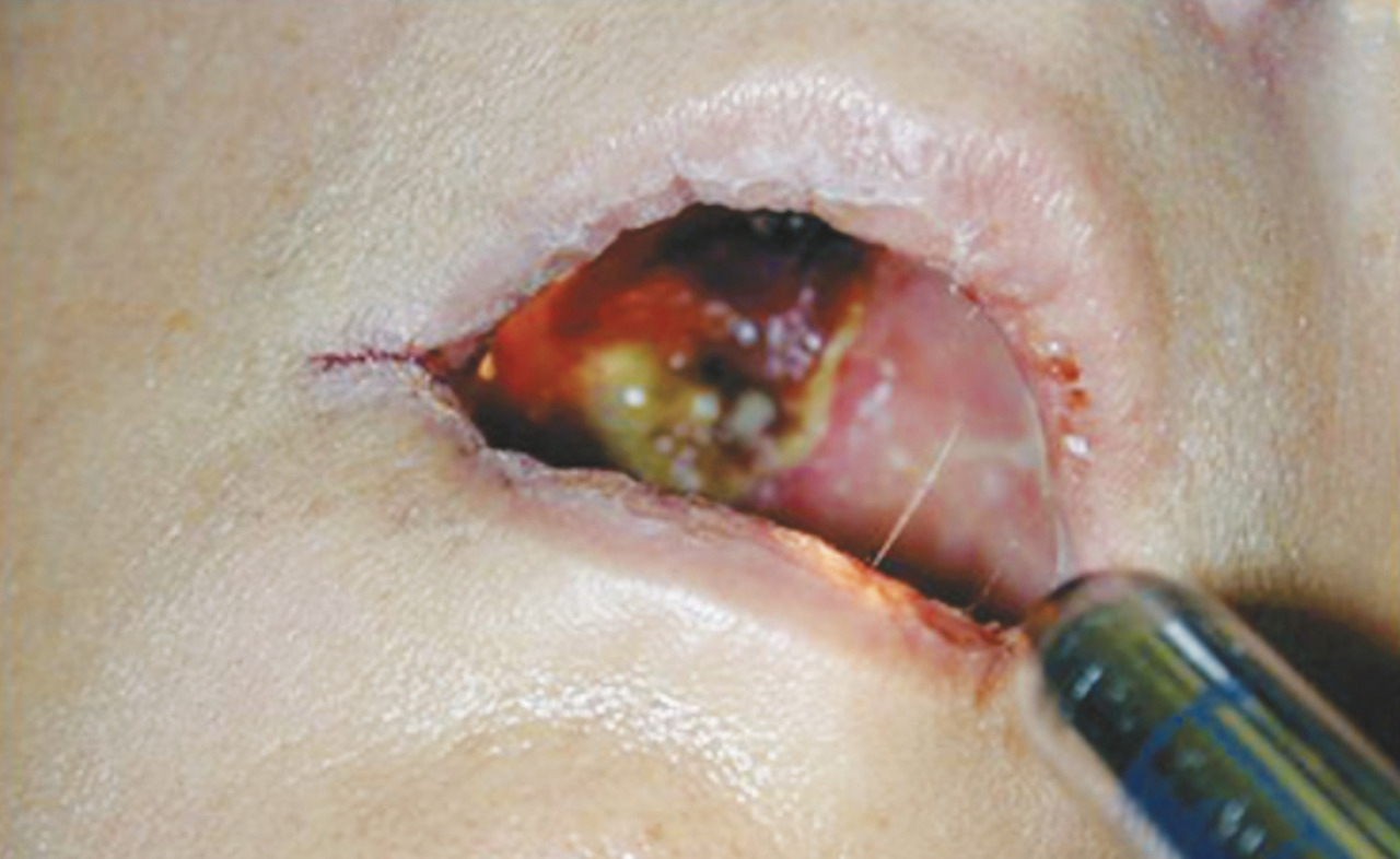 Le traitement est pluridisciplinaire et le plus précoce possible. Il associe un médicament antifongique intraveineux (amphotéricine B liposomale à forte dose en première intention), une correction maximale des facteurs favorisants (en particulier le contrôle du diabète) et un traitement chirurgical élargi, potentiellement répété, permettant l’excision large des tissus nécrosés.8,9 La chirurgie, qui implique parfois des gestes mutilants (exentération, maxillectomie avec sacrifice cutané), doit être discutée de façon collégiale en prenant en compte le terrain et le pronostic général de la pathologie sous-jacente.