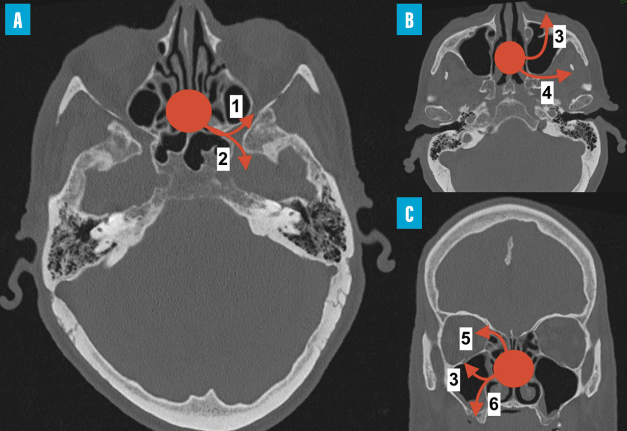 Le bilan comprend une imagerie par résonance magnétique (IRM) pour l’évaluation des tissus mous et une angio-tomodensitométrie (angio-TDM) pour rechercher une atteinte vasculaire. L’évolution de l’infection est en effet marquée par un angiotropisme. L’envahissement du sinus caverneux est une complication fréquente qui peut aboutir à un anévrisme mycotique de la carotide interne. L’envahissement de l’artère sphénopalatine peut entraîner l’invasion de la fosse infratemporale. L’extension depuis l’ethmoïde peut se faire vers l’orbite – induisant baisse d’acuité visuelle, ophtalmoplégie et exophtalmie – et/ou vers le compartiment intra-crânien (fig. 2).