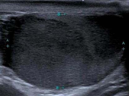 L’échographie révèle une masse hypoéchogène hétérogène du testicule droit (figure). Le TEP-scan montre également une fixation isolée au même niveau, sans atteinte ganglionnaire ni viscérale.