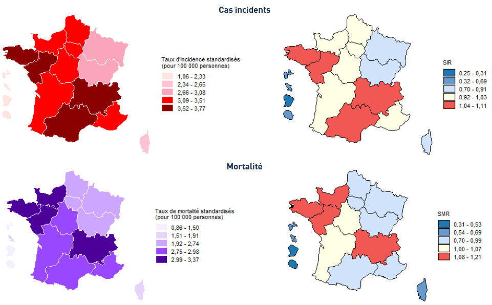 À l’échelle régionale et départementale, certaines zones présentent des excès d’incidence et de mortalité, statistiquement significatifs, par rapport à la moyenne nationale.